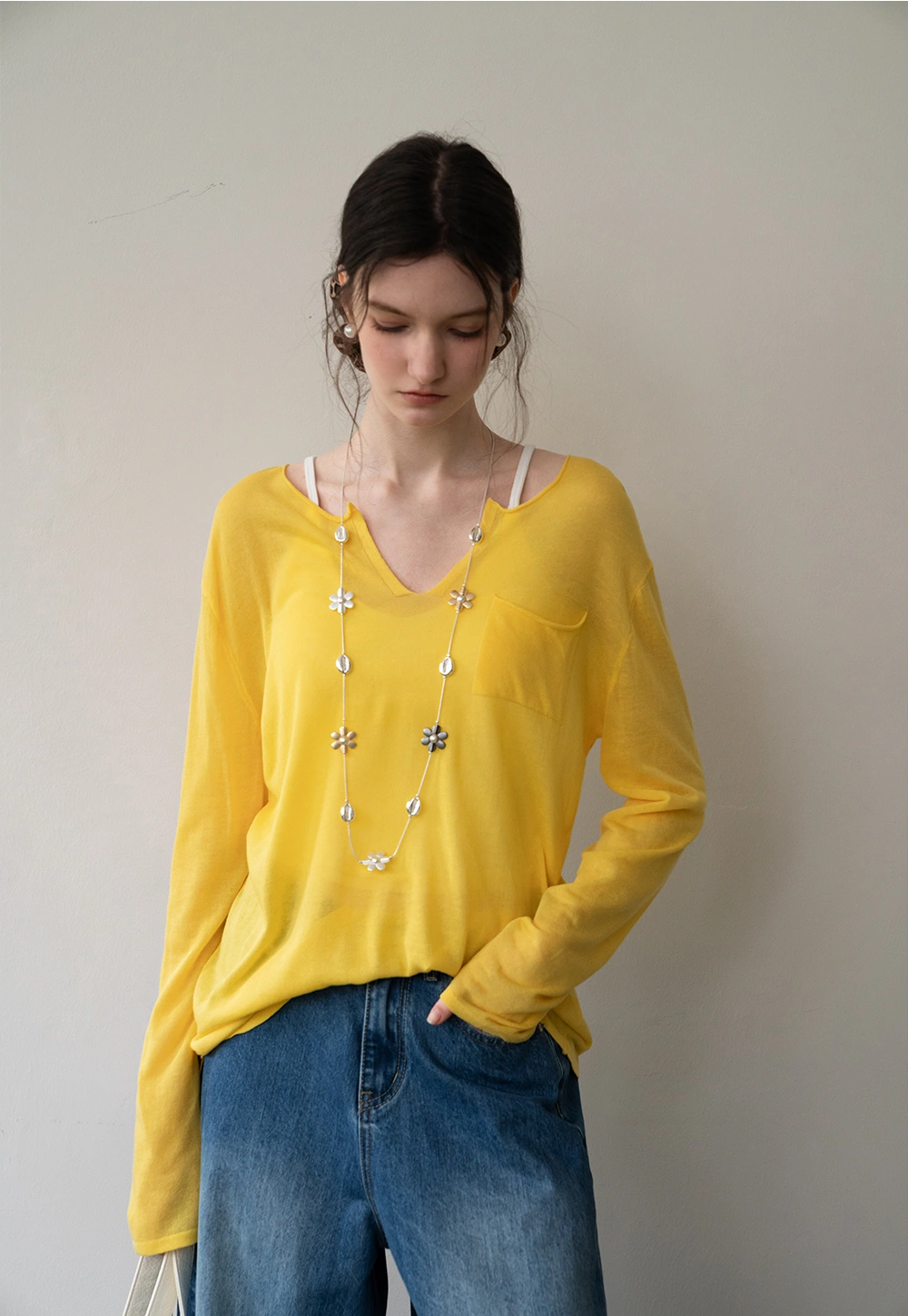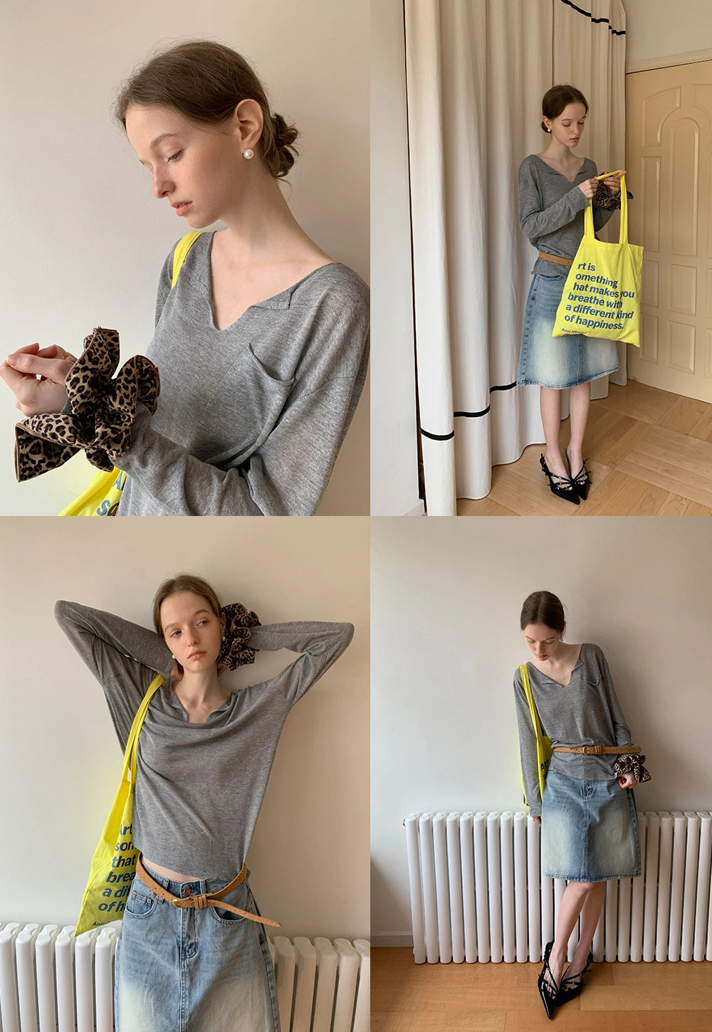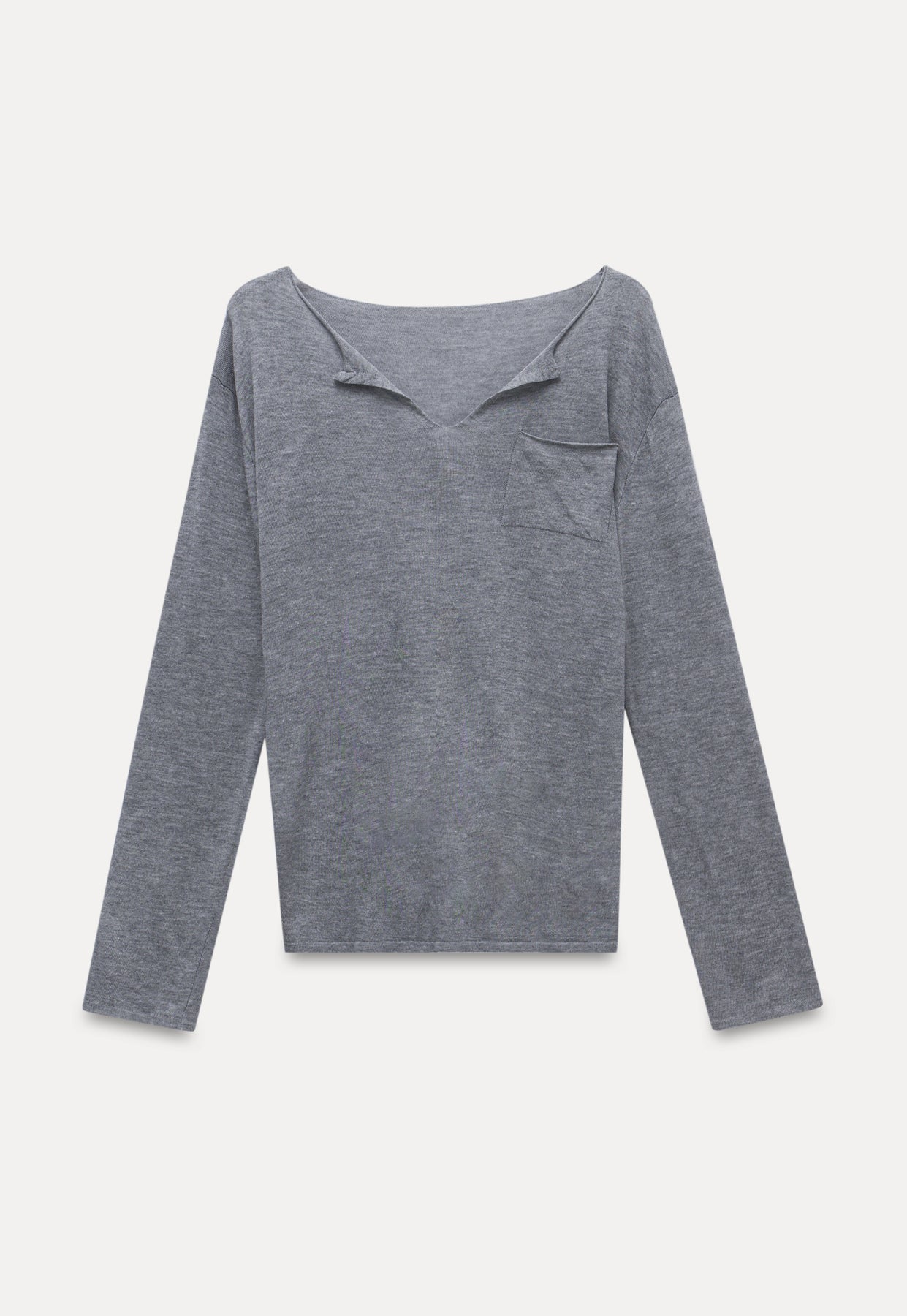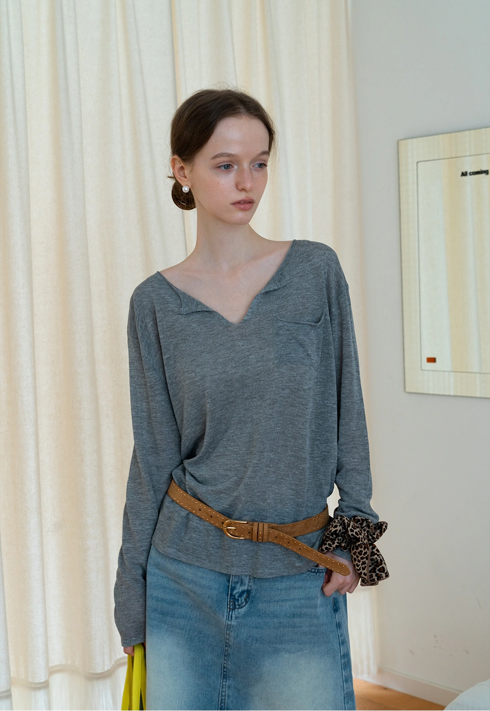 Women's V-Neck Collared Long Sleeve Top with Pocket